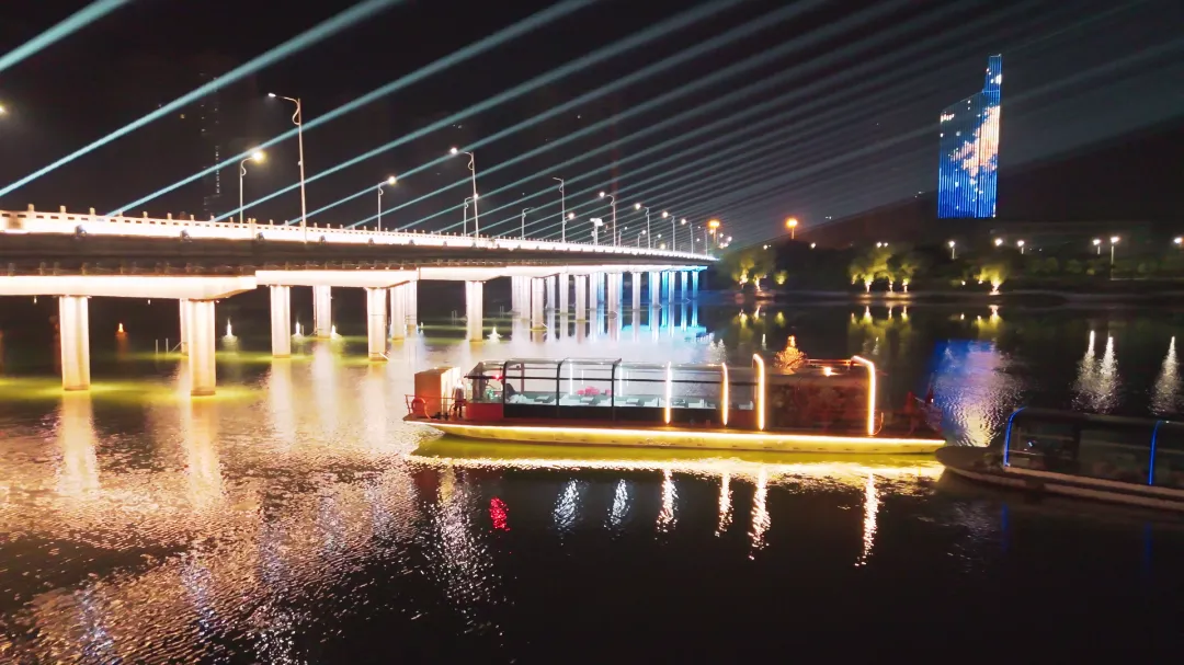 项目共配备3艘主题游船,其中“炎帝号”可容纳75人,“编钟号”与“银杏号”分别为40客位,充分满足不同游客群体的需求。乘船夜游不仅可欣赏“一湖两岸”绚丽的城市灯光秀,感受粼粼波光与璀璨灯火共舞,还可在编钟大桥领略激光划破夜空的震撼场景,更可与草甸子历史文化古街联动,实现千年古韵与现代光影的完美交融。
