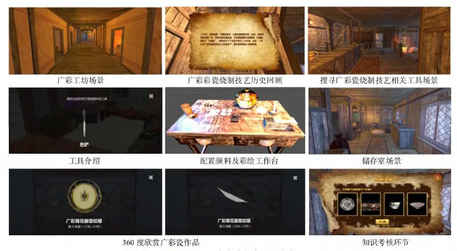 在广彩瓷烧制技艺历史发展的故事情境下玩家需要完成寻找遗失的工具、配置广彩颜料并绘制烧制广彩作品、识别广彩瓷等任务才能顺利复兴广彩瓷烧制技艺。通过这些任务环节,玩家既了解了广彩瓷烧制技艺的发展历史,又熟悉了广彩瓷烧制技艺制作工具及工艺流程和相关知识,还可近距离360°欣赏广彩瓷作品并聆听器语音介绍。