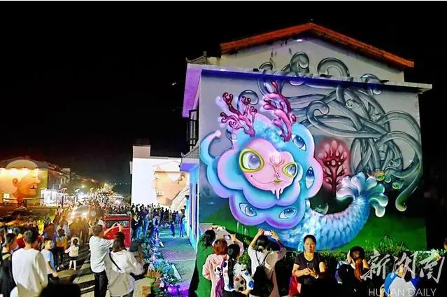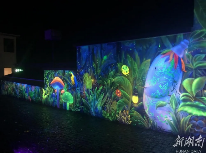 9月19日晚,众多游客在南县乌嘴乡罗文村欣赏大幅荧光涂鸦作品。当晚,艺术家们采用声、光、电现代科技与涂鸦绘画艺术相融合首创的“光影涂鸦”和“荧光涂鸦”系列作品完成,打造出特别的乡村夜色,助推了乡村经济。